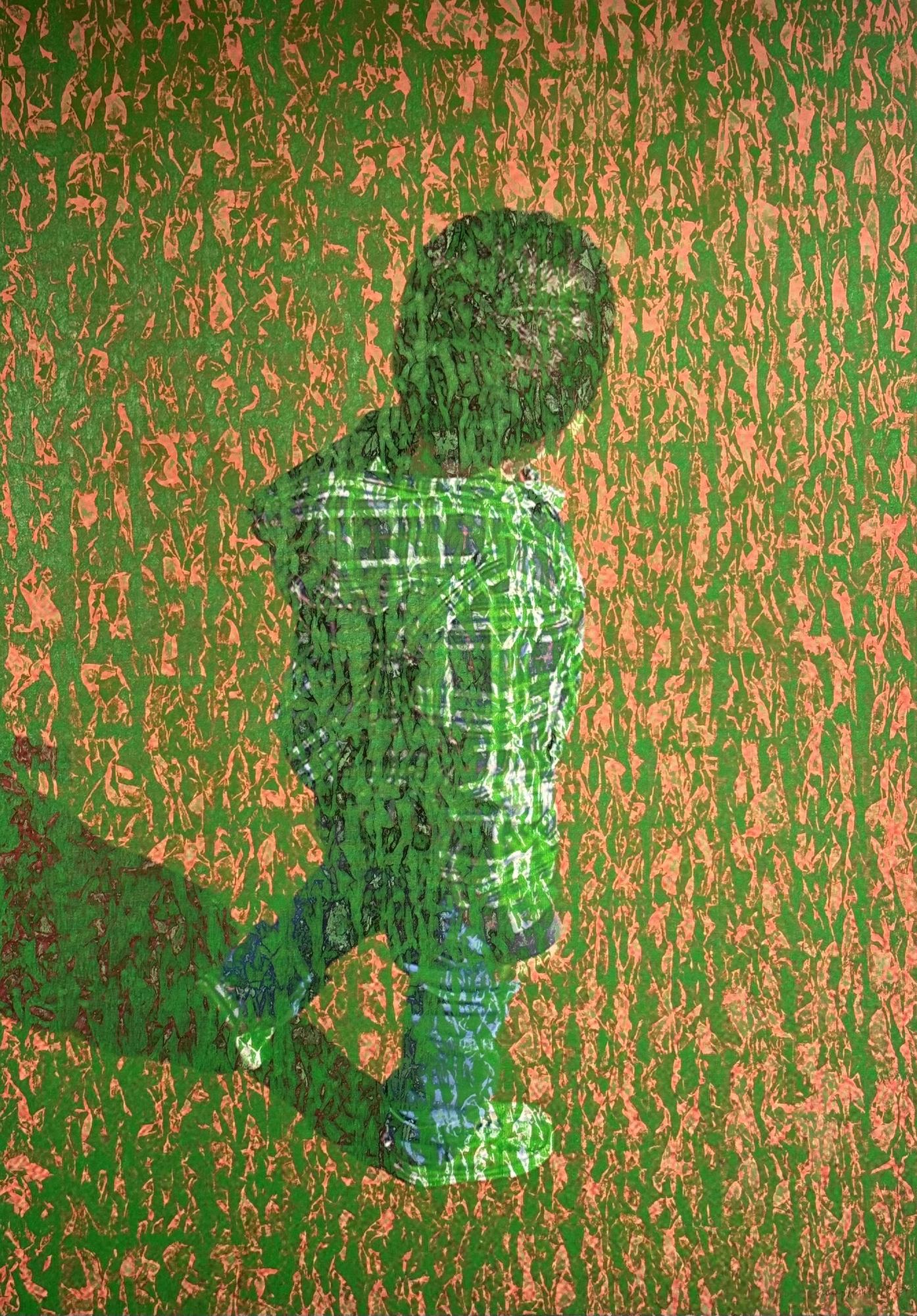 ELMAR PEINTNER, STRIPES 921GL Child behind green Curtain, Dafen Art Museum, Shenzhen,